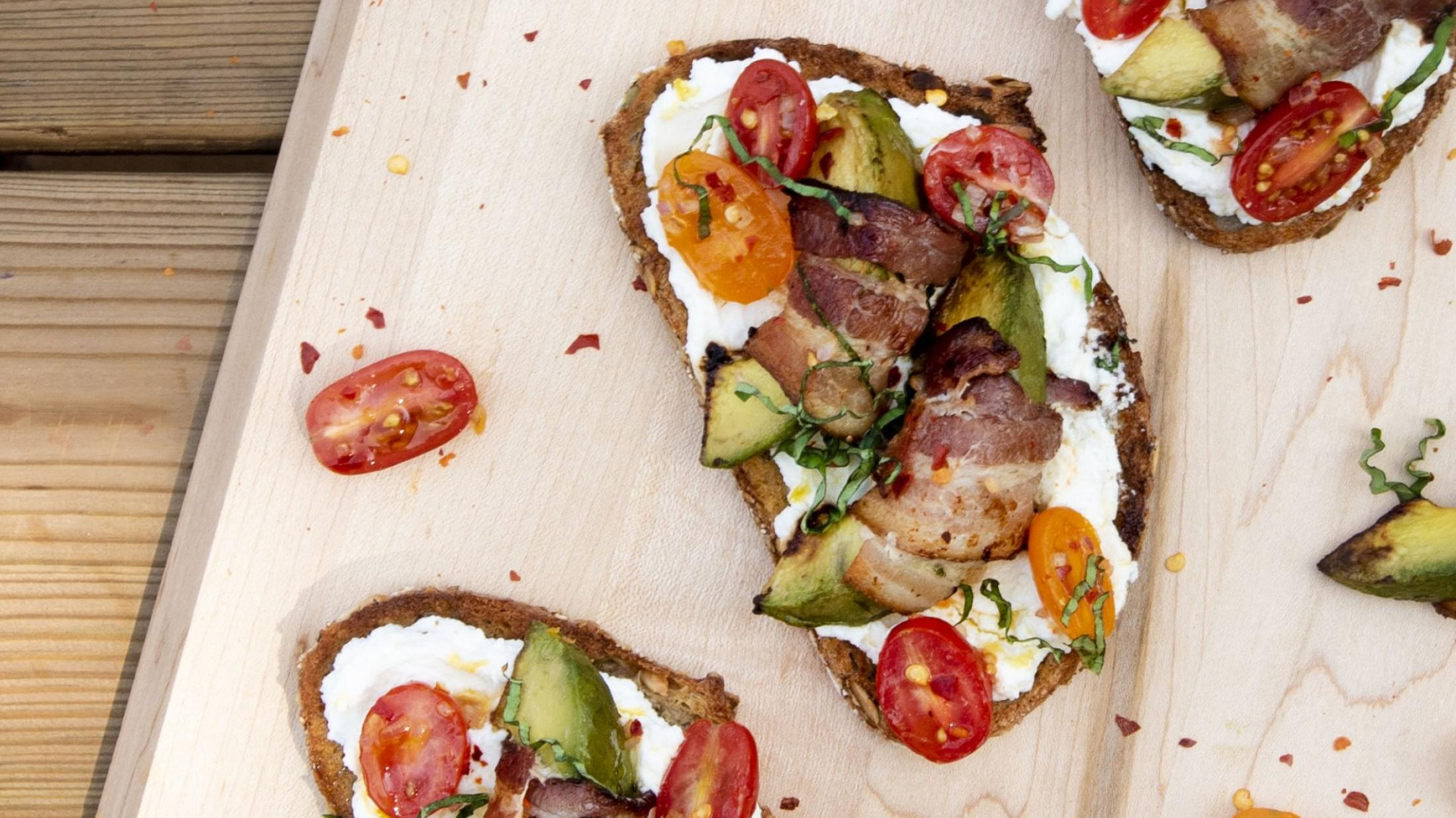 - Remove the ricotta from the fridge and spread generously and evenly over toasted bread. Top each toast with 2 pieces of bacon wrapped avocado.