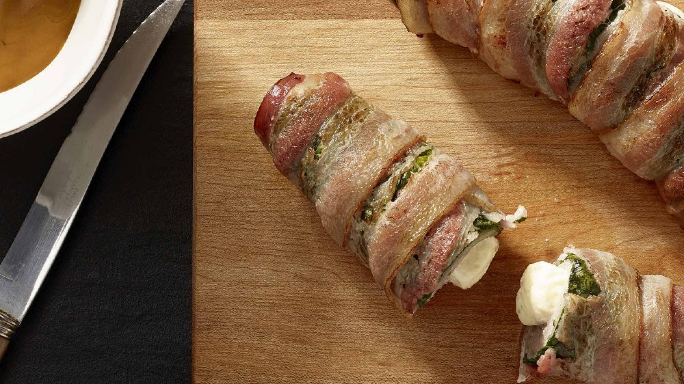 - Arrange the sausages on an aluminum baking sheet and cook for 15 to 20 minutes or until the sausages are cooked through and the bacon is crispy. If the barbecue has two grills, place the sausages on the top grill and the baking sheet underneath to keep fat from dripping onto the burners.