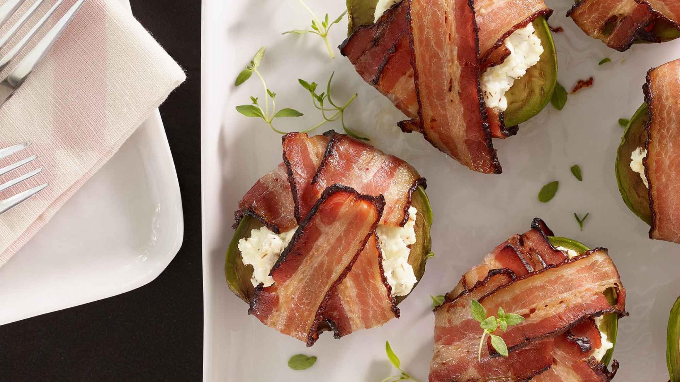 - Wrap each cheese-filled avocado with two slices of bacon.