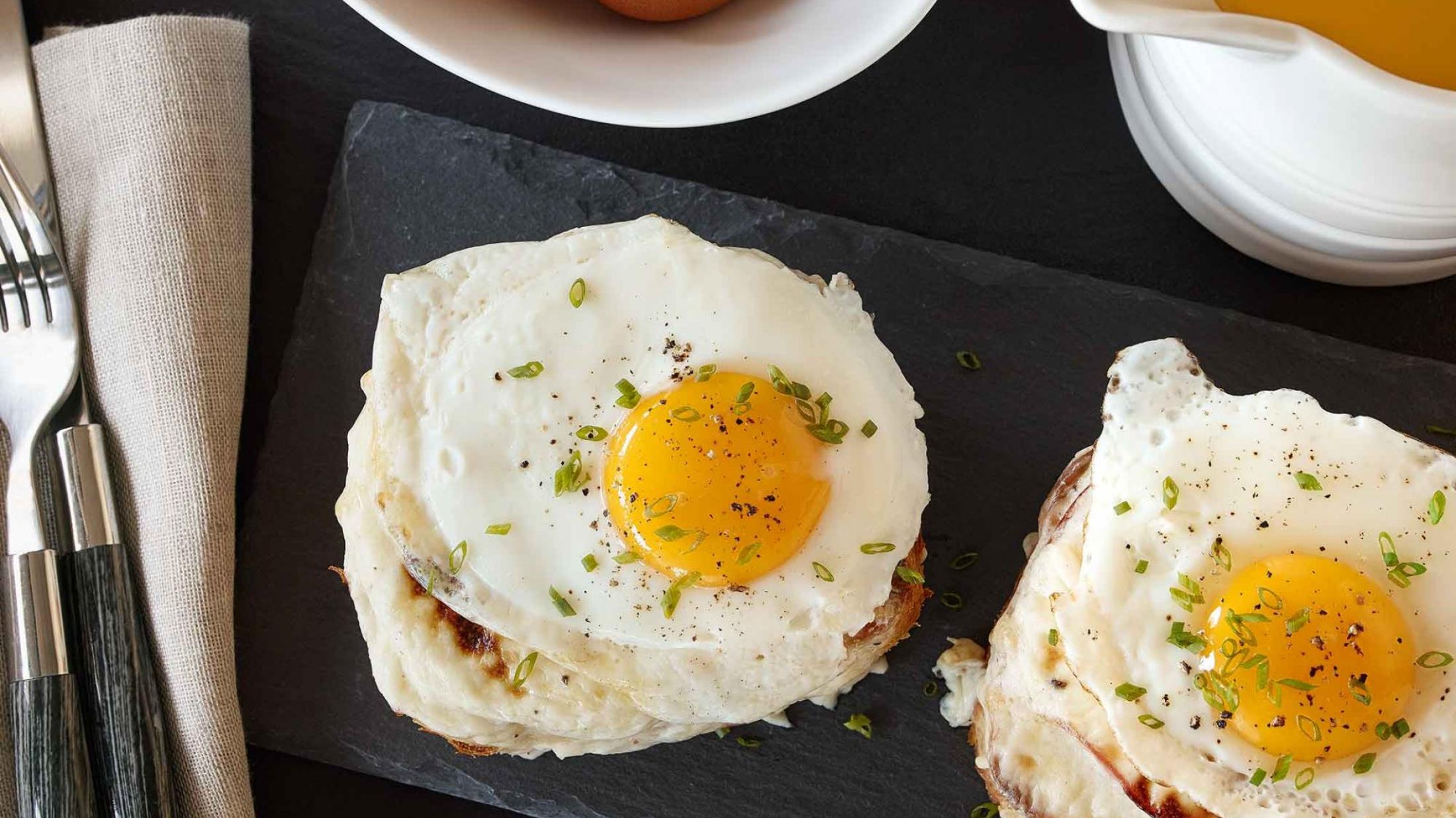 - Heat oil in a medium frying pan over medium to high heat. Cook eggs to preference. For Sunny Side Up, crack both eggs and fry for approximately 2 to 3 minutes or until the whites are set while the yolks remain soft. Place one egg onto each sandwich, garnish with chives and serve hot.