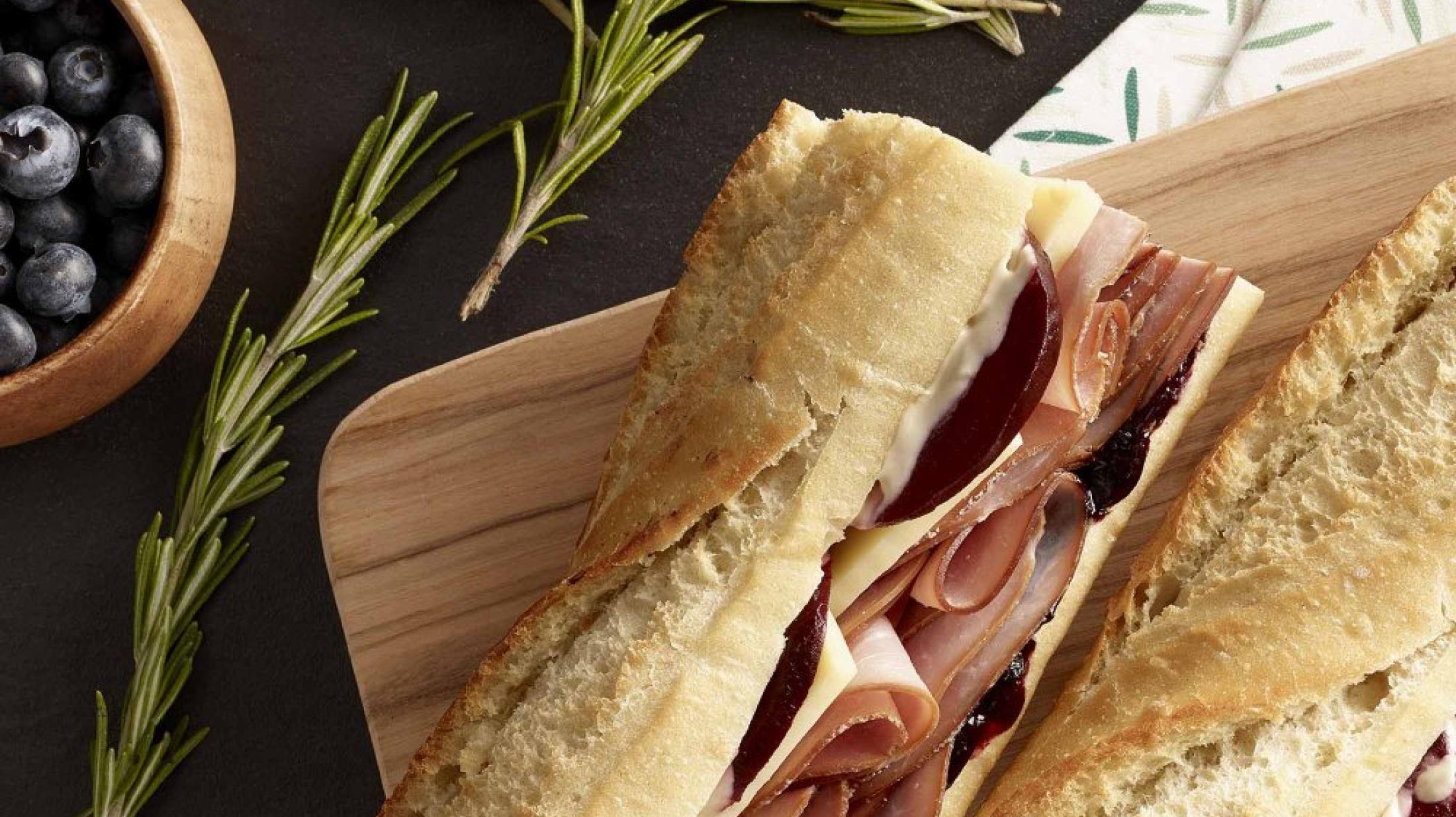 - Slice open the baguettes lengthwise, distribute the blueberry-rosemary spread on the bottom halves and then top with the ham followed by cheese and beets. Spread Dijonnaise sauce on the top halves and close the sandwiches.