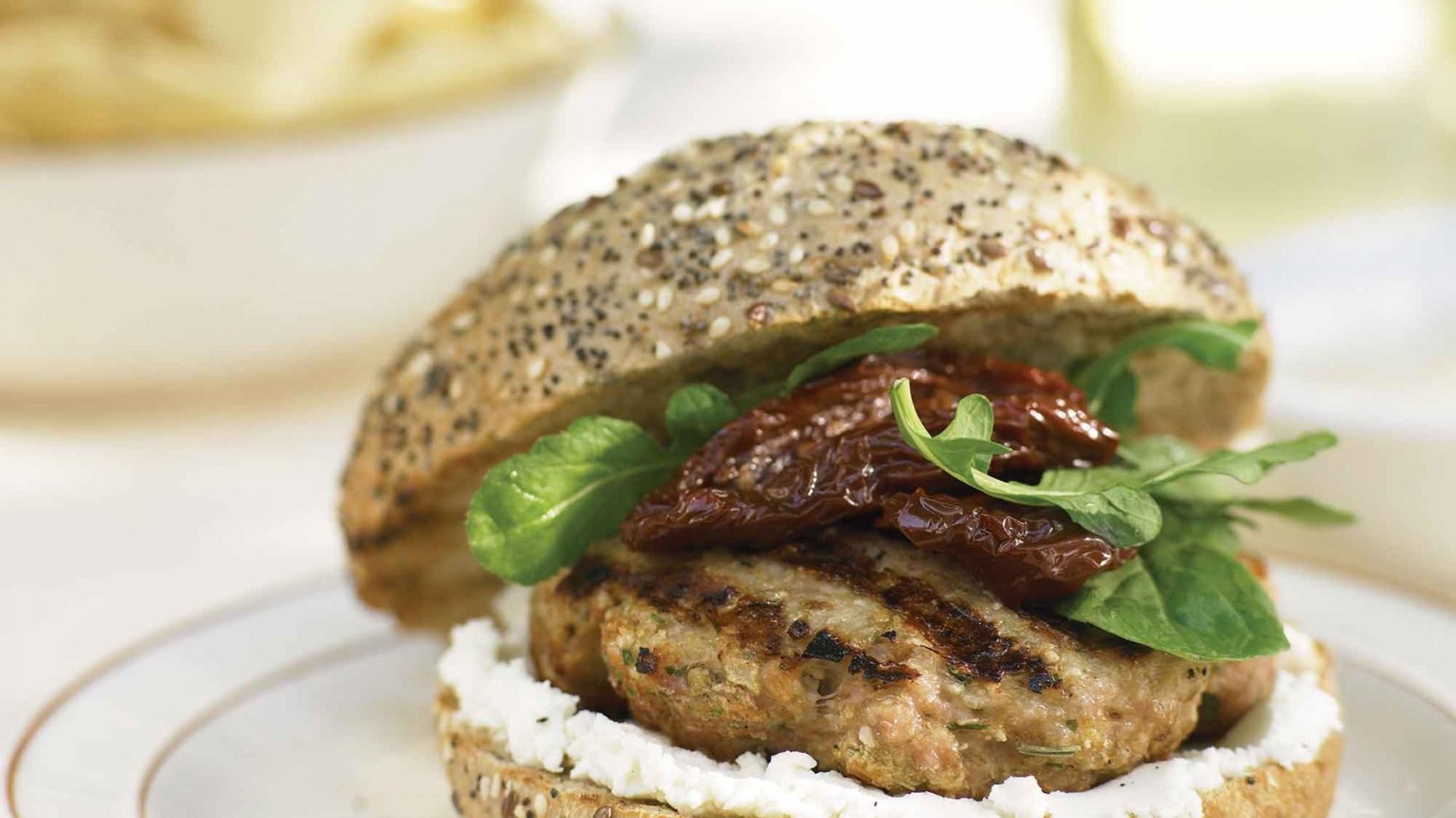 - Heat buns, spread goat cheese on bottom half of buns and place patties on buns followed by dried tomatoes and arugula.