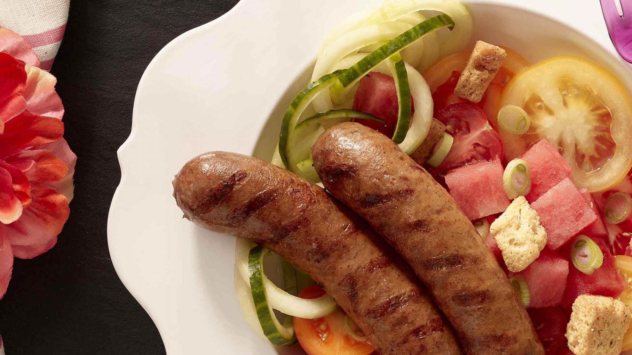 - Top with the sausages, dressing and croutons. Serve immediately.