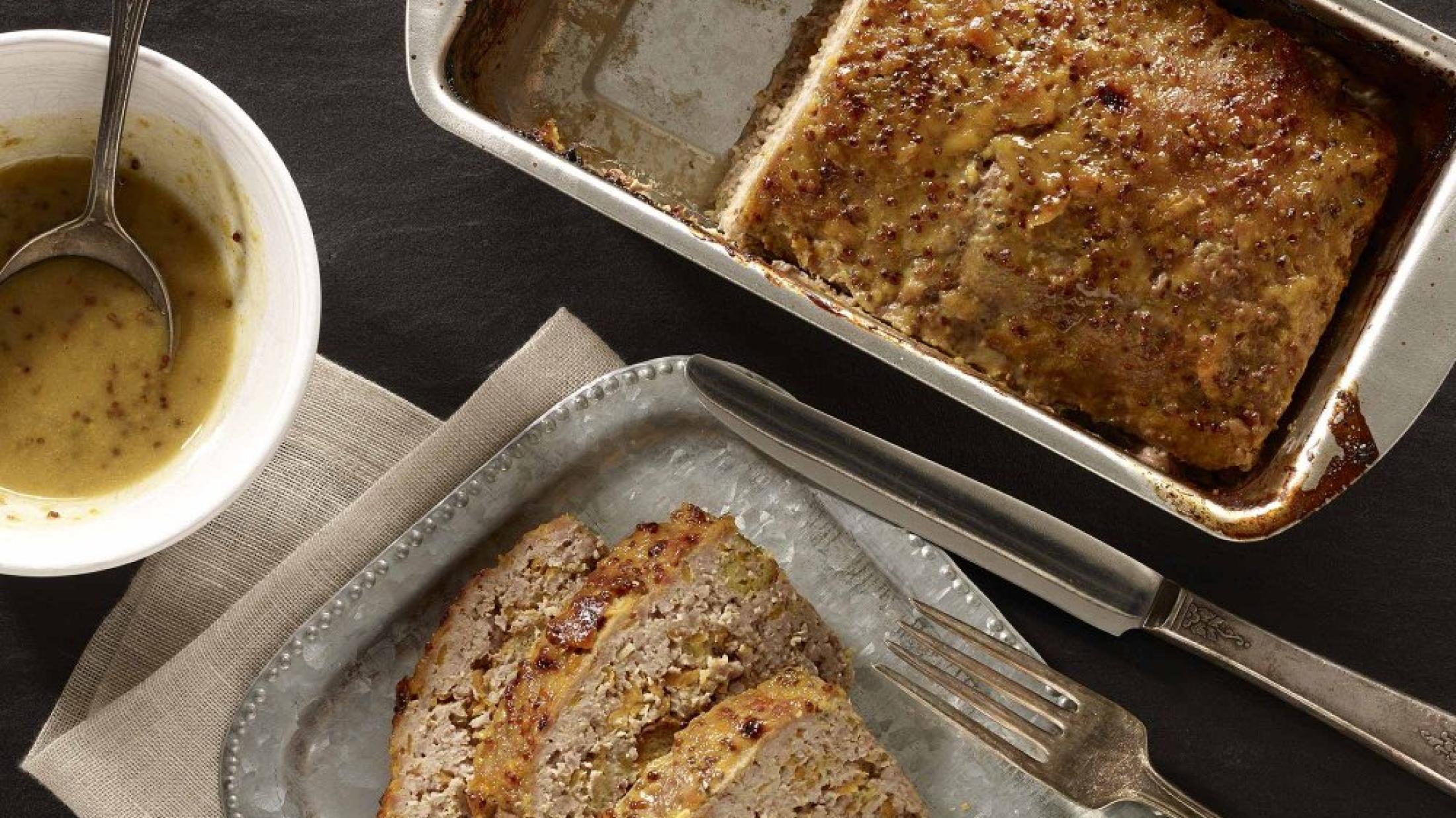 - In a small bowl, mix the mustards and honey. Pour over top of the meatloaf and spread evenly.