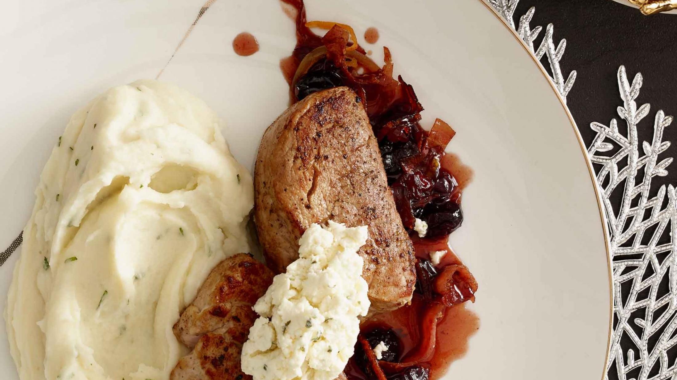 - Serve medallions in a pool of sauce and garnish with cheese piped from pastry bag.