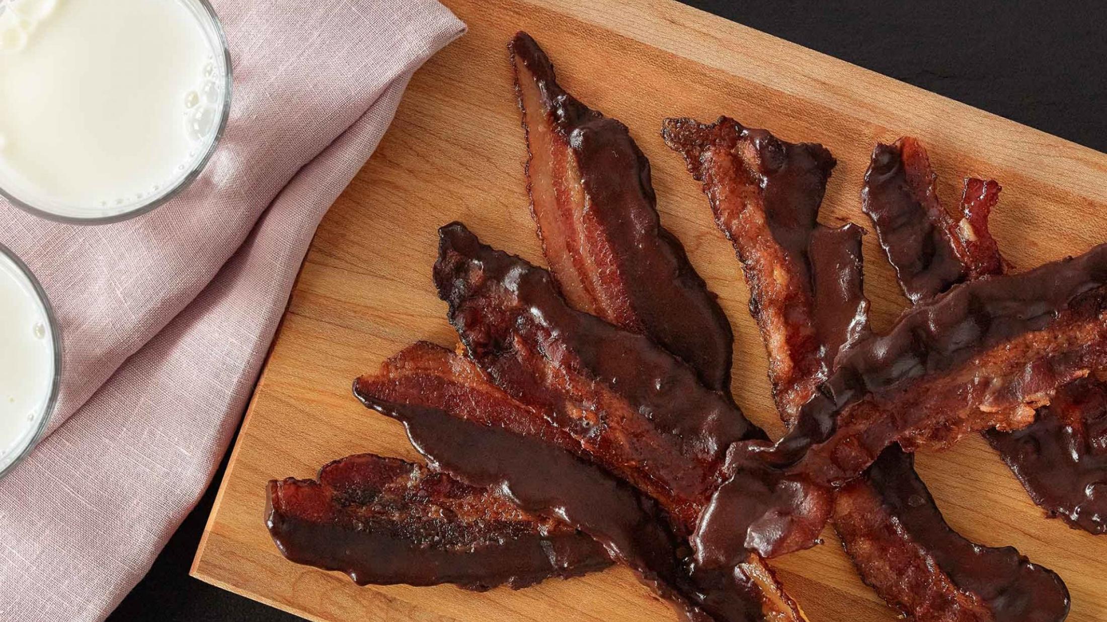- Tremper chaque lanière de bacon horizontalement dans le mélange de chocolat, en laissant une moitié sans chocolat.