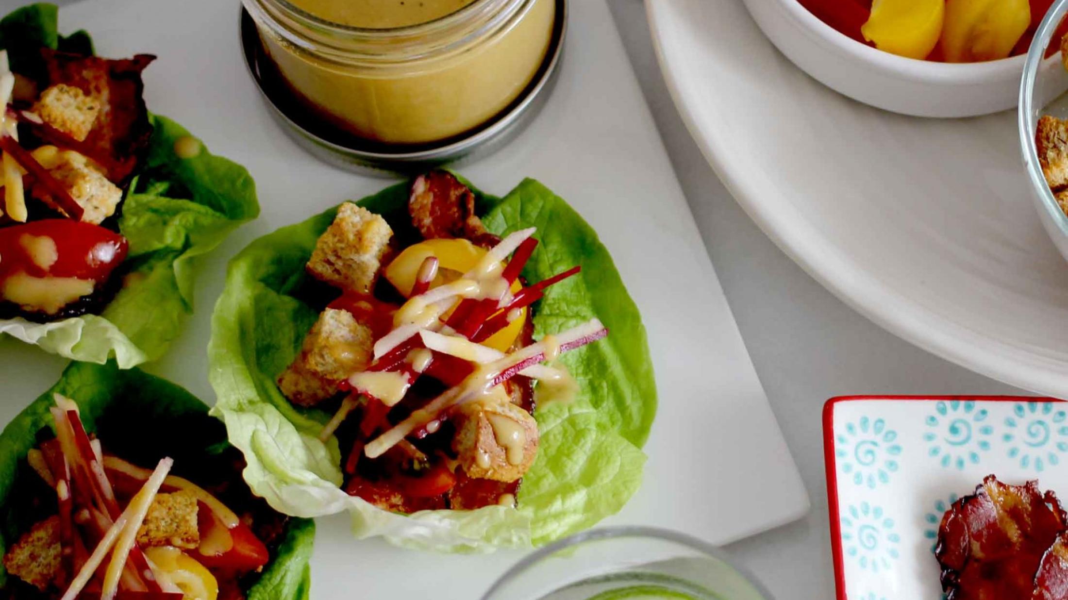 - Séparer et laver les feuilles de laitue. Éponger délicatement avec une serviette en papier et déposer sur une assiette de service. Ajouter deux demi-tranches de bacon, les tomates hachées et les croûtons sur chaque feuille de laitue. Garnir de la salade de pomme et betterave et de la vinaigrette Dijon et érable.