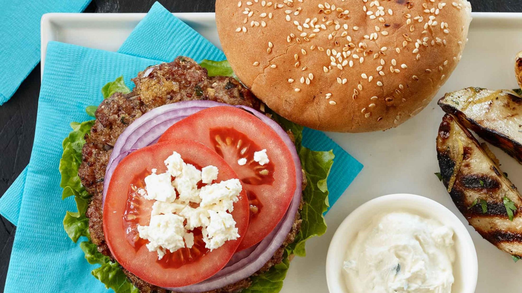 - Placer chaque galette sur un petit pain, et garnir de tzatziki, laitue, tomate, oignon rouge et le fromage feta. Servez immédiatement.