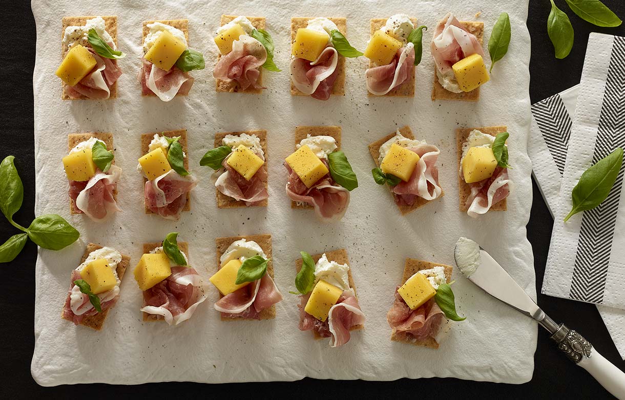 - Garnir les croutons de pâte avec en mettant le fromage de chèvre d’un côté, le jambon séché plié de l’autre, les dés de mangue sur les 2 et ajouter les petites feuilles de basilic et le poivre.