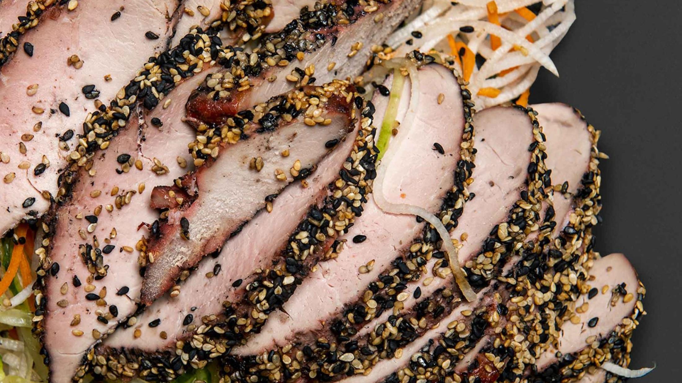 - Préchauffer le four à 350°F (175°C). Tapisser une plaque à pâtisserie de papier parchemin (ou placer une grille allant au four sur le dessus de la plaque). Dans un plat peu profond, mélanger les graines de sésame et réserver. Retirer les filets marinés et jeter le liquide de marinade. Rouler les filets dans les graines de sésame, en pressant les graines pendant que vous roulez pour les aider à adhérer, jusqu'à ce que le filet entier soit complètement enduit de graines de sésame. Transférer sur la plaque à pâtisserie et faire rôtir de 20 à 25 minutes ou jusqu'à ce que la température interne atteigne 145°F (65°C). Couvrir la viande avec du papier d'aluminium (créer une tente qui conservera la chaleur, sans serrer la viande) et laissez-la reposer pendant 10 minutes.