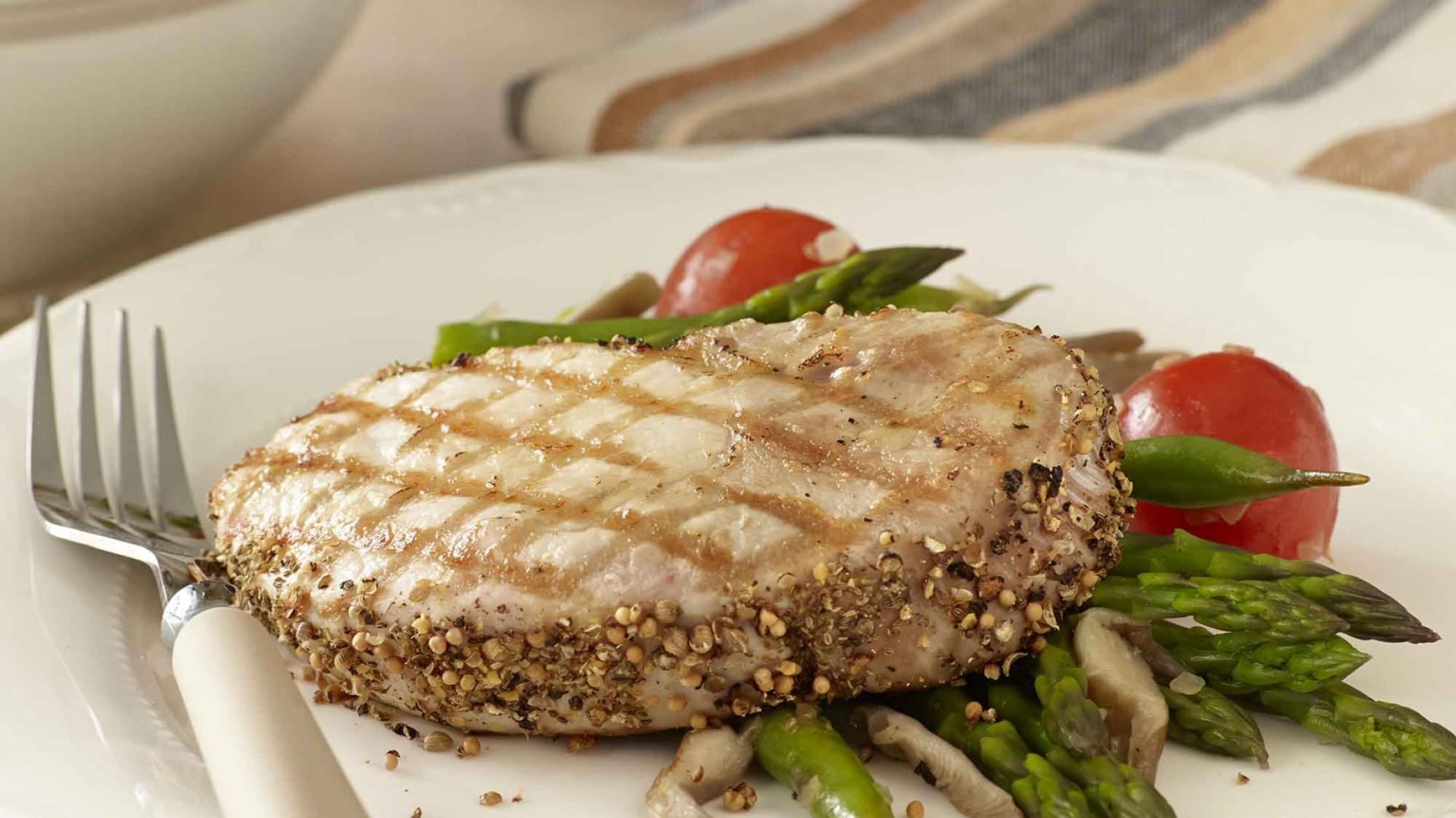 Côtelettes de faux-filet de porc et son émulsion d’asperges au basilic