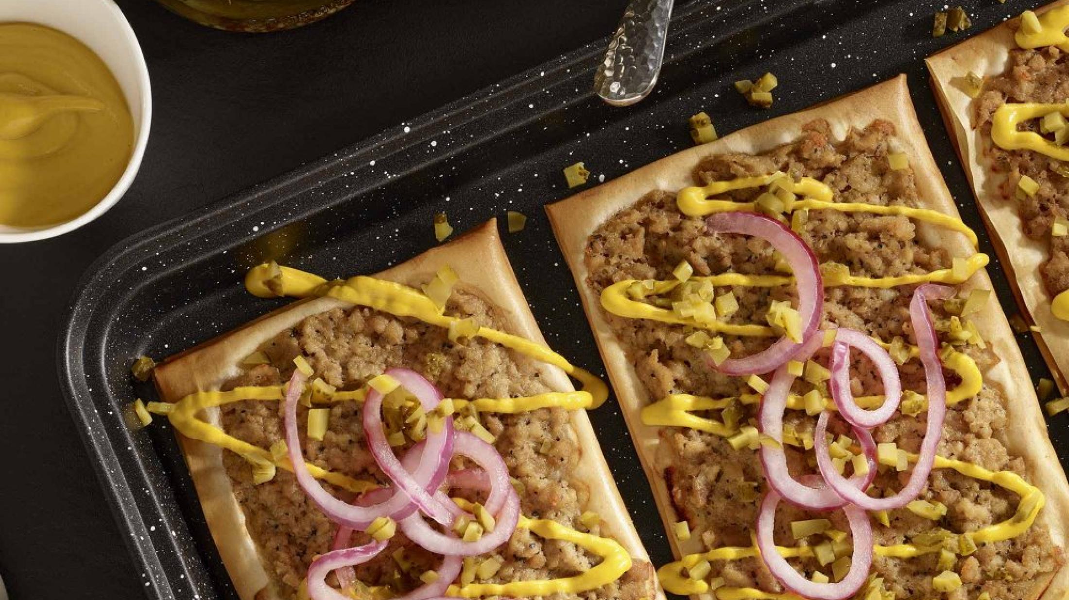 - Garnir les feuilletés aux cretons d’un filet de moutarde, d’oignon marinés et de cornichons.