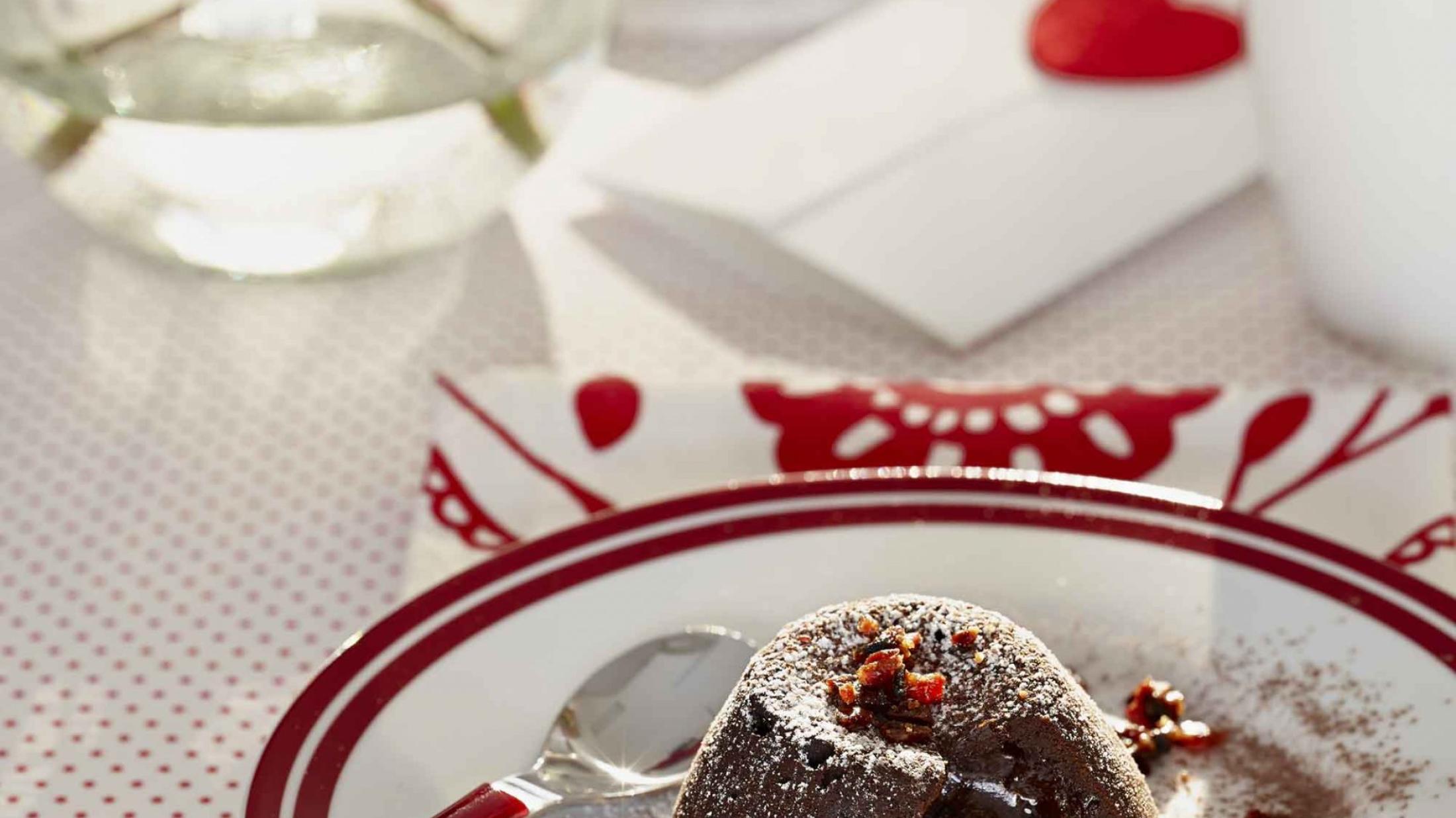 - Partager la pâte dans les ramequins et cuire au centre du four 12 à 15 minutes. Le centre doit rester fondant (mou et légèrement liquide) Renverser dans les assiettes, démouler et servir chaud garni du reste de bacon caramélisé, de cacao et de sucre à glacer.