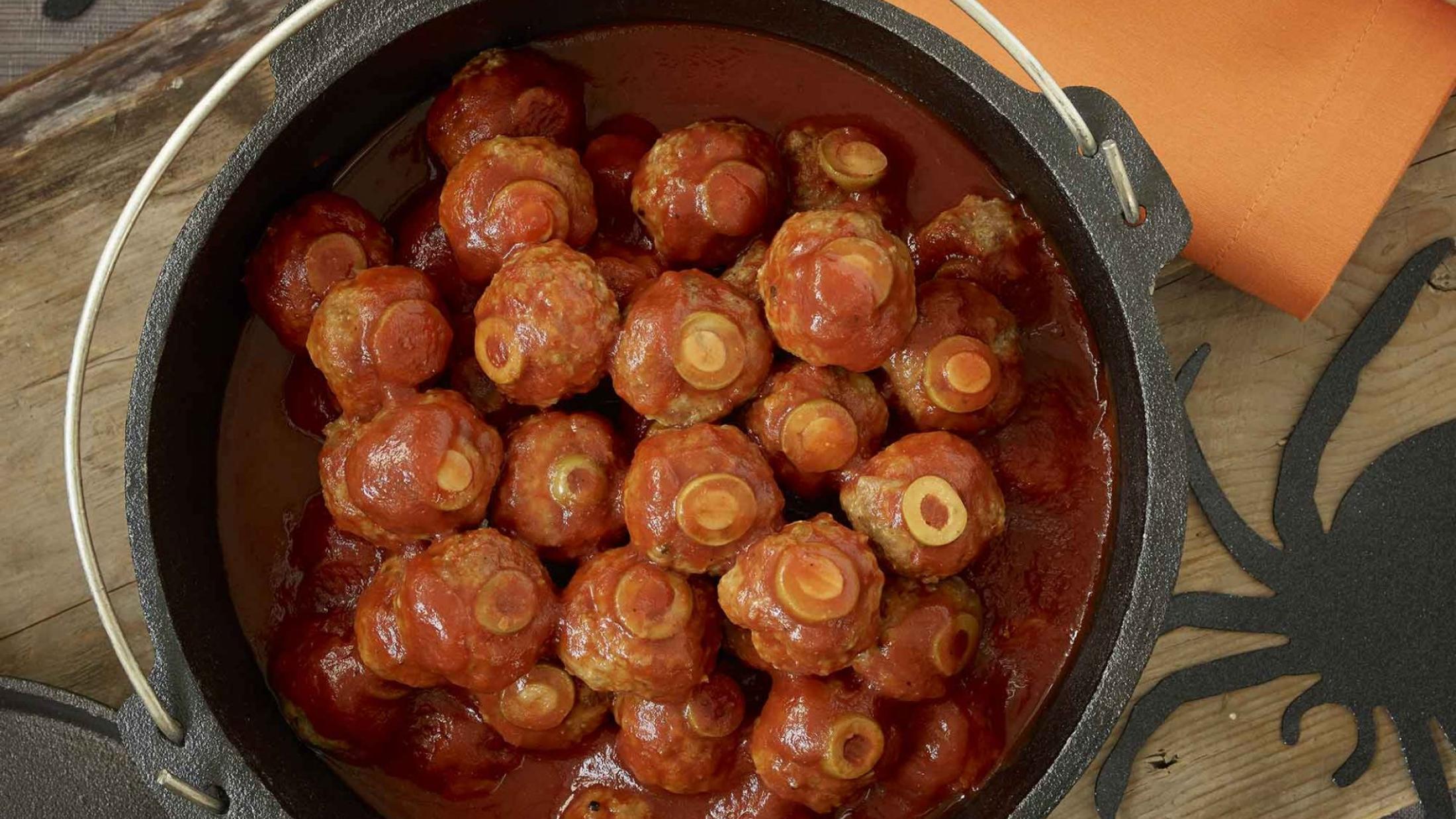 - Former des boulettes d'environ 2,5 cm (1 po) de diamètre et y enfoncer une demie olive pour créer un ``œil``.