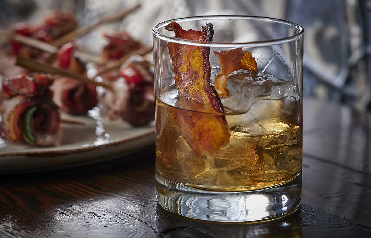 - Remplir un verre à whisky à moitié de glaçons. Ajouter le Campari, le gin et le vermouth rouge et agiter. Garnir de la tranche de bacon et de la lame de zeste d’orange et servir.
