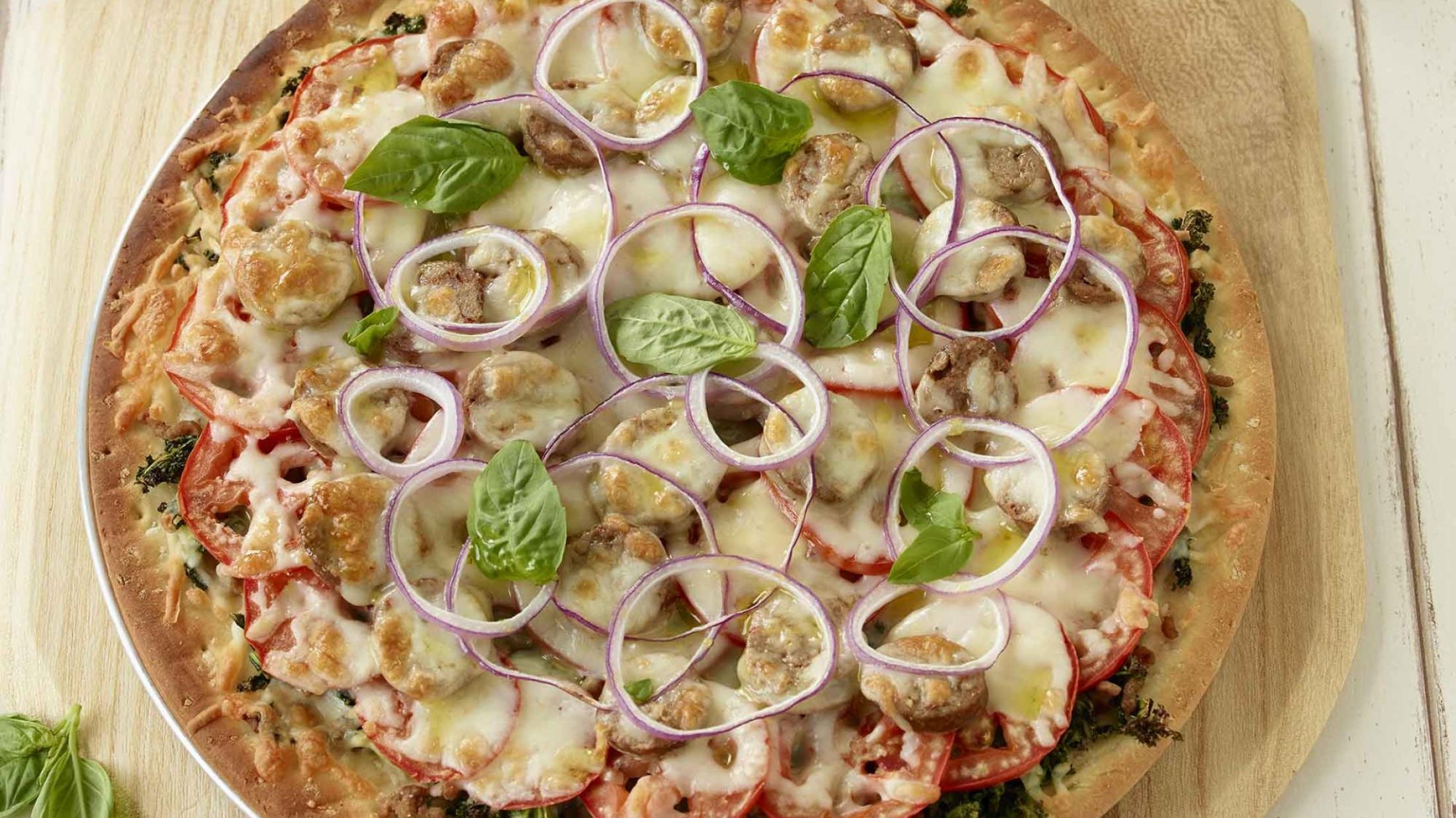 - Étaler le mélange de porc et de chou sur la croûte à pizza, garnir avec la moitié du fromage, ajouter les tranches de tomate et les rondelles de merguez, couvrir avec le reste de fromage et finir avec les oignons rouges.