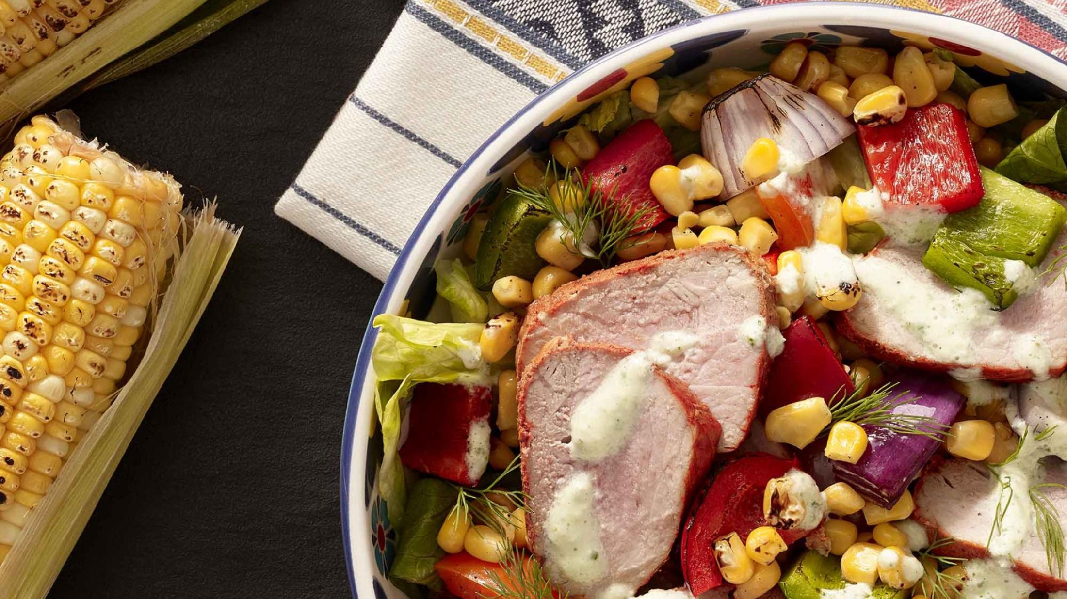 - Servir les légumes rôtis et le porc tranché sur les laitues, arroser de vinaigrette et garnir d’aneth.