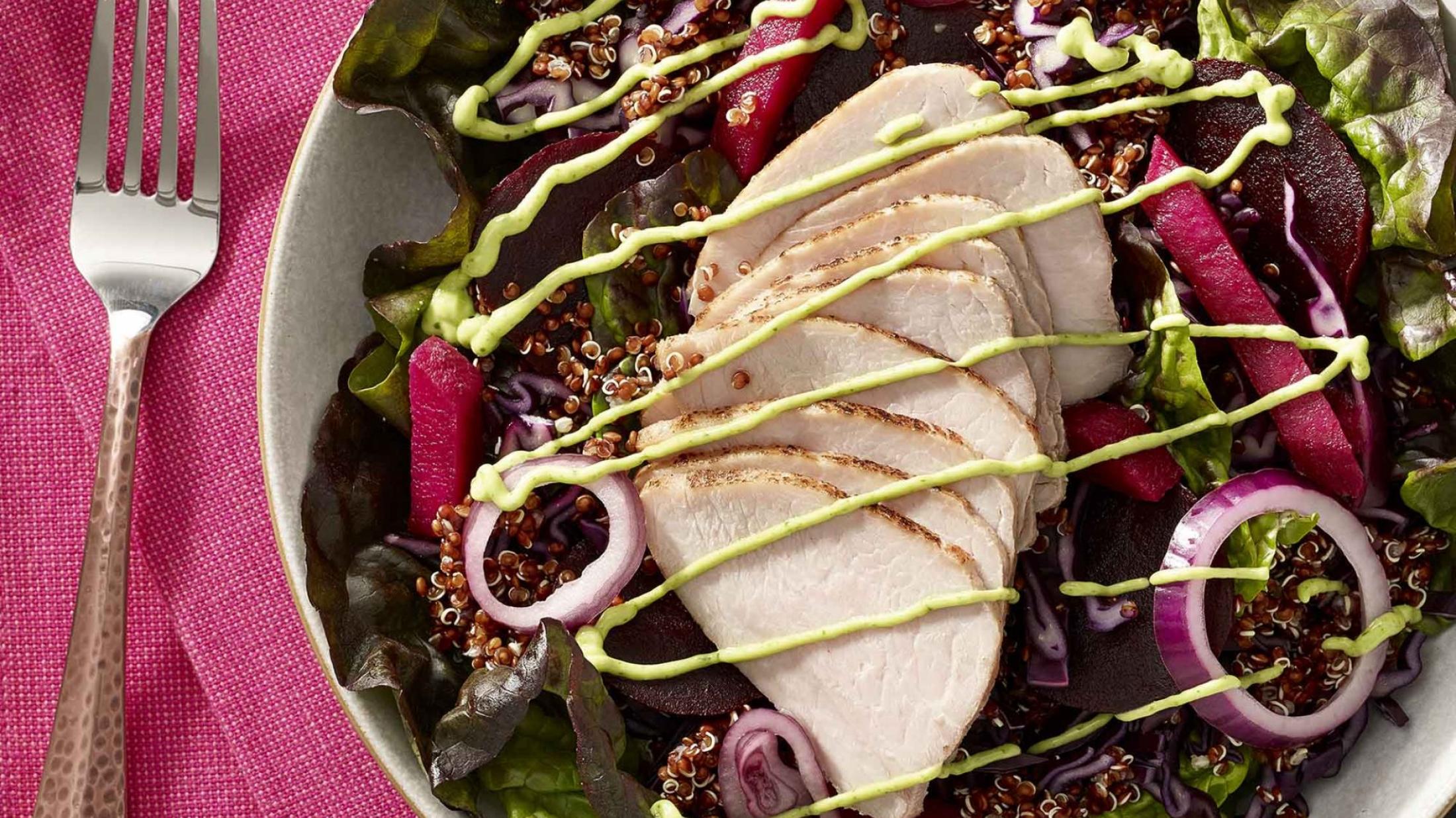 - Partager dans les assiettes, la laitue et le chou, suivi du quinoa, des betteraves, des oignons, des navets et finalement de la vinaigrette. Servir immédiatement.