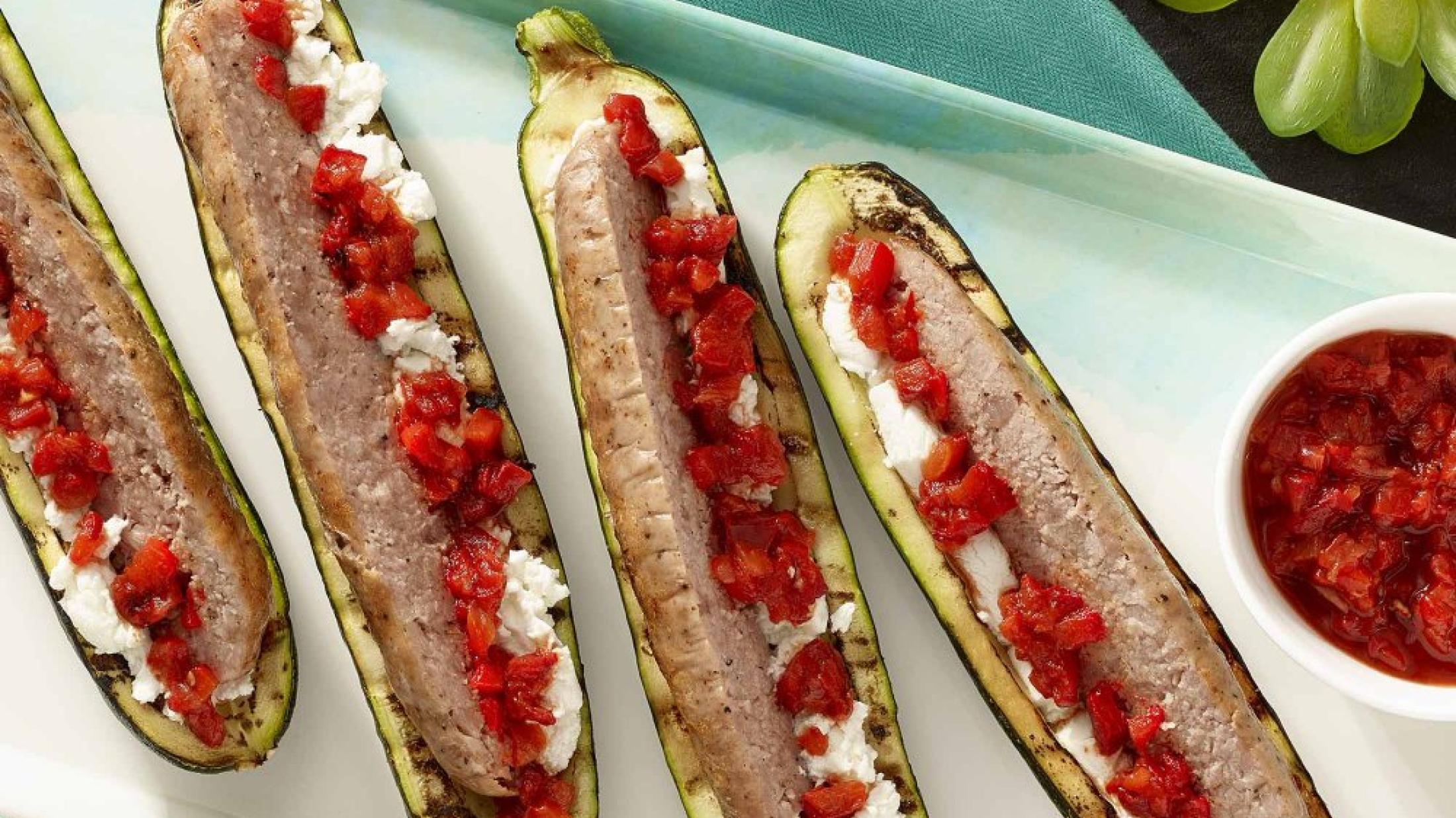 - Étendre un peu de fromage de chèvre dans la cavité des courgettes, ajouter les demi-saucisses et garnir avec la salsa de poivron rôti.